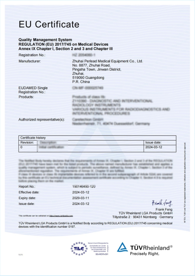 The Perlead 9600 Dynamic FPD Digital Radiography & Fluoroscopy system has obtained the EU CE-MDR certification, which is also the first CE certificate for DRF (MDR) new regulations in China. This certification means that the Perlead 9600 series meets the strict medical device regulations of the European Union and can freely circulate in the EU market, bringing high-quality diagnosis and treatment services to more European patients.